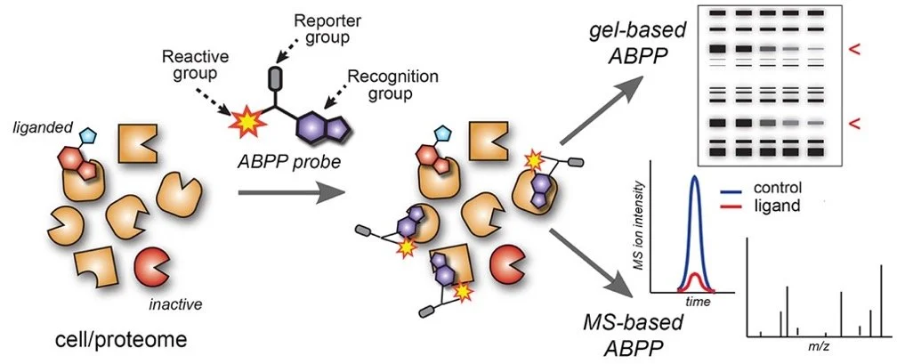 Our lab has pioneered the development of the activity-based protein profiling (ABPP) technology, which uses broad-spectrum chemical probes to functionally characterize large numbers of proteins in native biological systems (Figure 1). Original strategies for ABPP focused on creating chemical probes for specific enzyme families, such as hydrolases, deacetylases, and kinases. These “class-specific” probes are commercially available and remain in widespread use but are restricted to proteins with well-defined active sites. To address this limitation, we have more recently introduced advanced ABPP strategies for simultaneously evaluating the reactivity and small-molecule interactions of thousands of sites on proteins from diverse structural and mechanistic classes.
